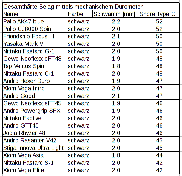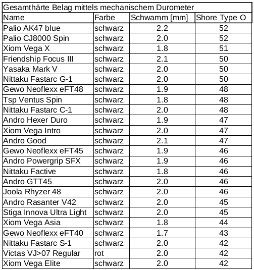 Ausgangspunkt ist der Belag Soulspin P12. Beworben wird er mit "Gesamthärte: 52°" Ich besitze z.B. ein Holz mit einem Belag Palio CJ8000 Spin 2.0 mm schwarz. Mein Durometer Shore-O zeigt bei ihm ebenfalls eine Gesamthärte von 52°. Wiederhole ich die Messung am Palio mit einem Durometer des gleichen Herstellers, diesmal aber Shore-A, erhalte ich Werte von 29°-32° (ich schiebe das auf die dünne Messspitze und den Zufall, ob im Bereich einer Innennoppe oder dazwischen angesetzt wurde). Wäre die Gesamthärte des P12 also in 52° Shore-A spezifiziert, dann müsste der P12 exorbitant härter als der CJ8000 mit seinen 29°-30° Shore-A sein. Kann man wohl ausschliessen. - Zudem wäre die Angabe Gesamthärte 52° wegen der dünnen Shore-A Nadel kaum sinnvoll, sondern vielmehr ein Streubereich (bspw. 50°-53°). Folgerung: Soulspin gibt die Gesamthärte nicht in Shore-A an. Es könnte möglicherweise noch ein dritter Härtegrad gemeint gewesen sein, den ich bisher nicht kenne, aber Typ Shore-O wäre aufgrund der guten Übereinstimmung mit meinem 52° Shore-O Palio ein heißer Kandidat. Sollte die Gesamthärte von Soulspin also tatsächlich in Shore-O angegeben worden sein, dann werden deren Schwämme wohl kaum in einer anderen Einheit angegeben worden sein. Angeboten werden Schwammhärten dort abgestuft von 51° bis 56°. Aktuelle Neuentwicklungen, wie z.B. Andro R53, haben Gradzahlen in der gleichen Größenordnung. Steile These: Sind die Angaben von Soulspin tatsächlich in Shore-O, was nach dem bisher Gezeigten nicht unwahrscheinlich ist, dann dürften auch alle europäischen ESN-Schwämme ebenfalls in Shore-O (und nicht Shore-A) angegeben sein. |