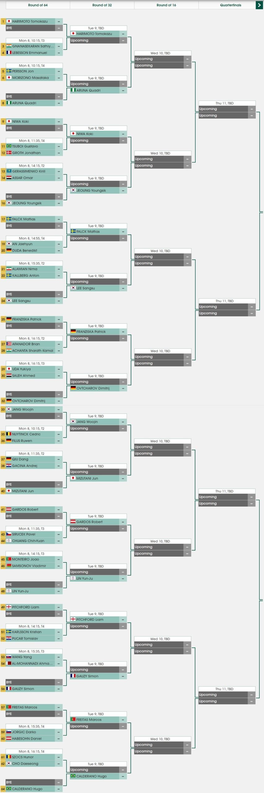 Runde der letzten 64 Damen/Herren: 08:00 Uhr; Tisch 1: Cheng - Batra 08:15 Uhr; Tisch 2: Filus - Nuytinck08:15 Uhr; Tisch 3: Gnanasekeran - Lebesson 08:15 Uhr; Tisch 4: Persson - Morizono 08:40 Uhr; Tisch 1: Kim - Madarasz 08:55 Uhr; Tisch 2: Mikhailova - Yuan 08:55 Uhr; Tisch 3: Lin - Gapanova 08:55 Uhr; Tisch 4: Zeng - De Nutte 09:20 Uhr; Tisch 1: Yang - Yu 09:35 Uhr; Tisch 2: Qiu - Gacina09:35 Uhr; Tisch 3: Sirucek - Chuang 09:35 Uhr; Tisch 4: Tsuboi - Groth 10:00 Uhr; Tisch 1: Kihara - Shin 10:15 Uhr; Tisch 2: Källberg - Balazova 10:15 Uhr; Tisch 3: Kim - Zhang 10:15 Uhr; Tisch 4: Vega - Matelova 12:00 Uhr; Tisch 1: Meshref - Choi 12:15 Uhr; Tisch 2: Gerassimenko - Assar 12:15 Uhr; Tisch 3: Monteiro - Samsonov 12:15 Uhr; Tisch 4: Karlsson - Pucar 12:40 Uhr; Tisch 1: Mittelham - Vivarelli12:55 Uhr; Tisch 2: Lee - Xiao 12:55 Uhr; Tisch 3: Noskova - Sawettabut 12:55 Uhr; Tisch 4: Duda - An13:20 Uhr; Tisch 1: Shan - Odo13:35 Uhr; Tisch 2: Alamian - Källberg 13:35 Uhr; Tisch 3: Wang - Al-Mohannadi 13:35 Uhr; Tisch 4: Jorgic - Habesohn 14:00 Uhr; Tisch 1: Takahashi - Diaz 14:15 Uhr; Tisch 2: Afanador - Achanta 14:15 Uhr; Tisch 3: Uda - Saleh 14:15 Uhr; Tisch 4: Szocs - Cho Mixed Achtelfinale: 16:00 Uhr; Tisch 1: Mizutani/Ito - Afanador/Diaz 16:15 Uhr; Tisch 2: Vivarelli/Boboccia - Lebesson/Yuan 16:15 Uhr; Tisch 3: Karakasevic/Lupulesku - Khanin/Trigolos 16:15 Uhr; Tisch 4: Pistej/Balazova - Madrid/Silva 16:40 Uhr; Tisch 1: Stoyanov/Piccolin - Jeon/Lee 16:55 Uhr; Tisch 4: Takahashi/Ishiy - Pergel/Szudi 17:20 Uhr; Tisch 1: Robles/Xiao - Cheng/Lin 18:00 Uhr; Tisch 1: Ionescu/Szocs - Pavade/Flore |